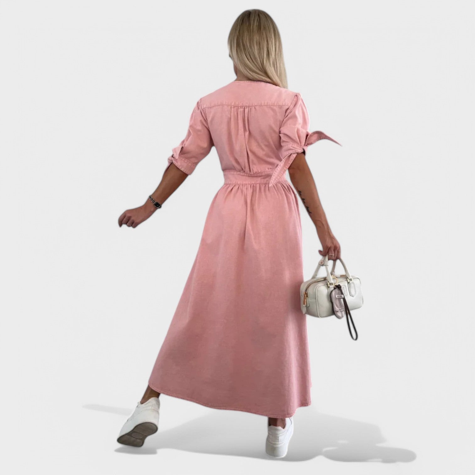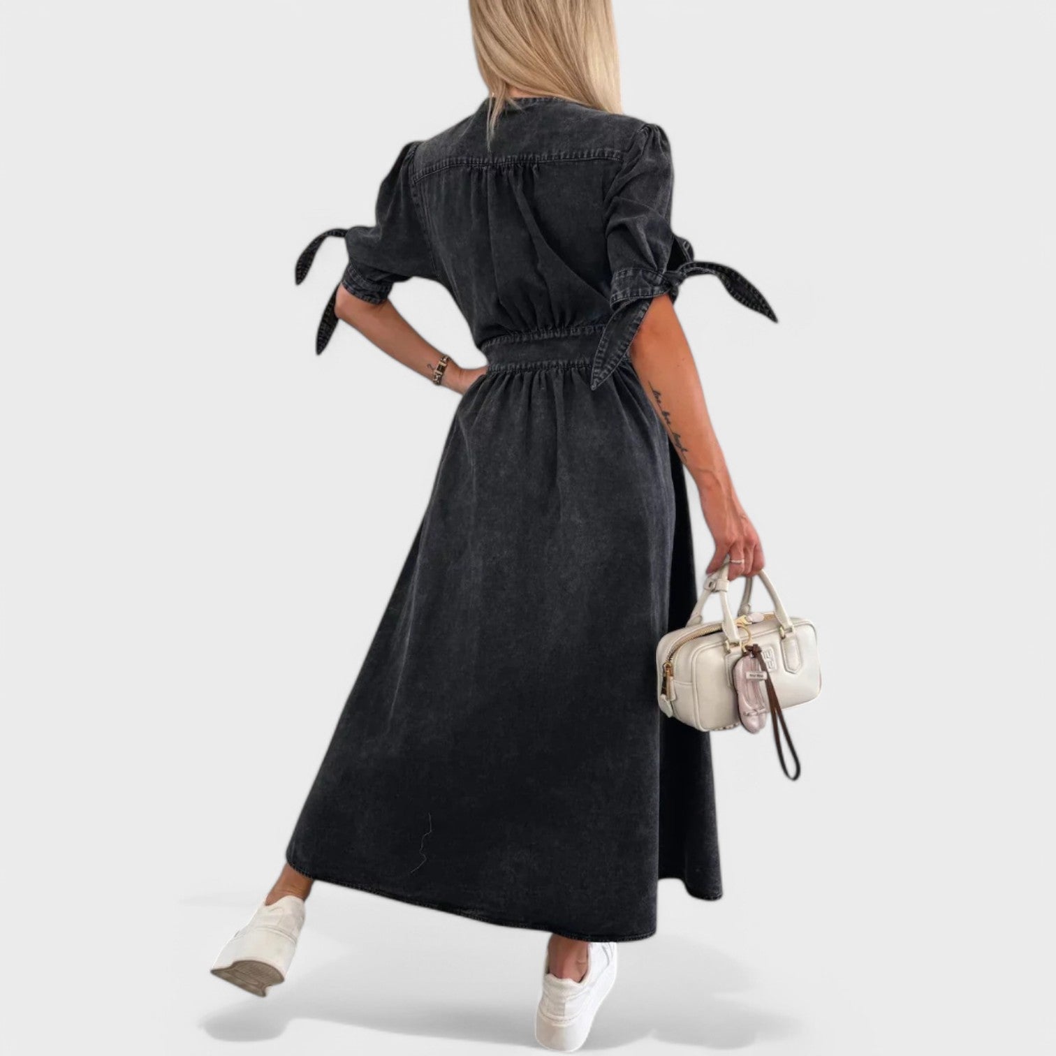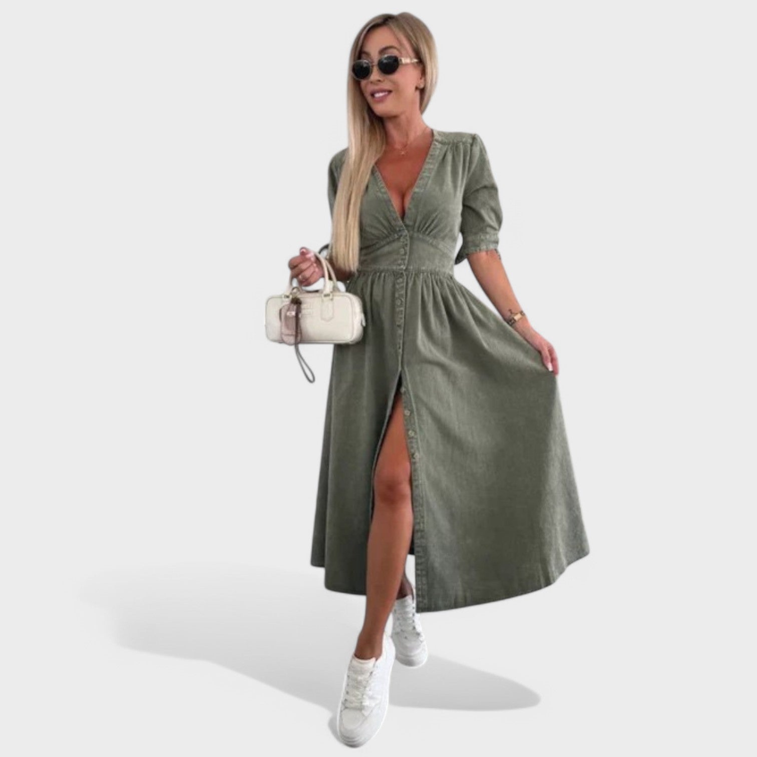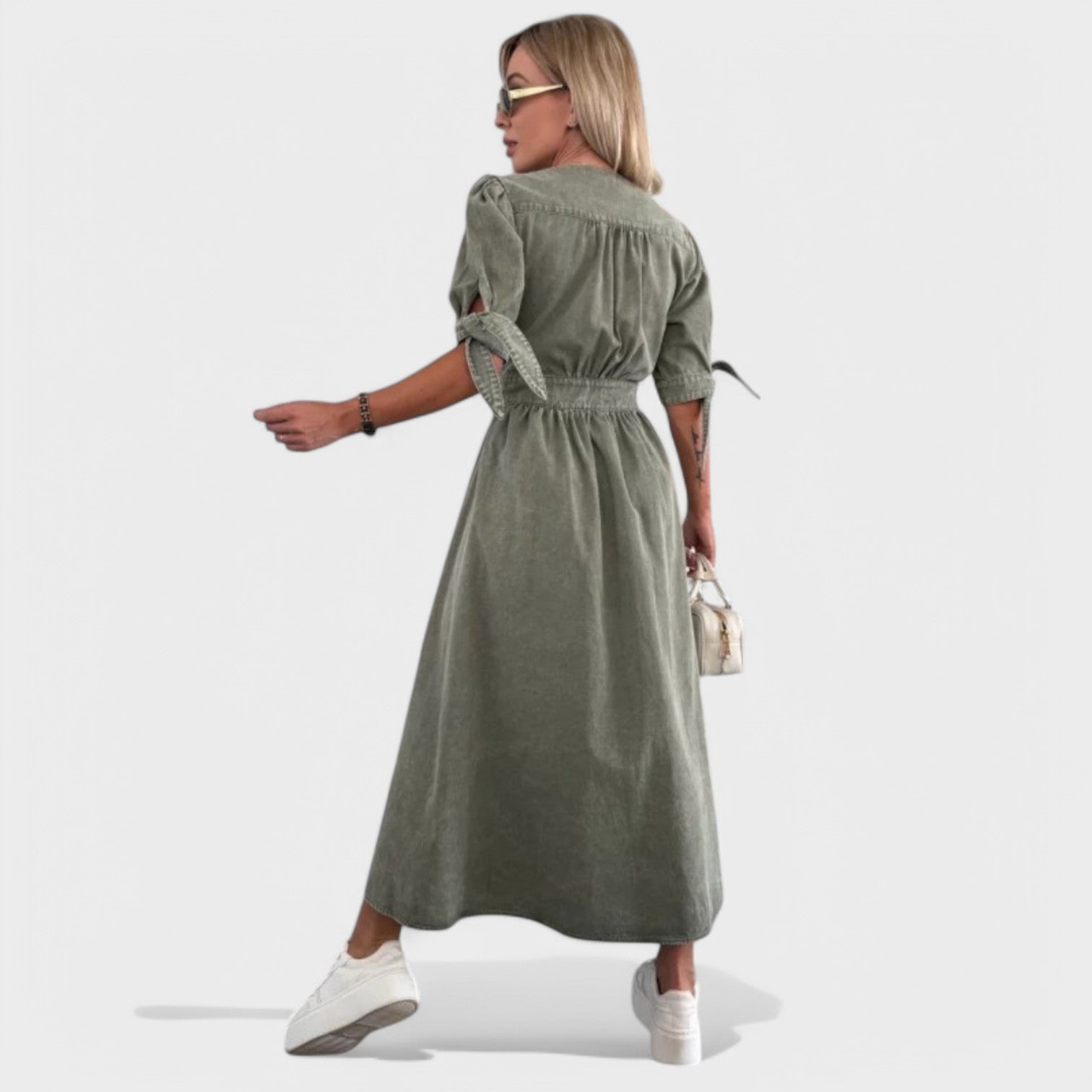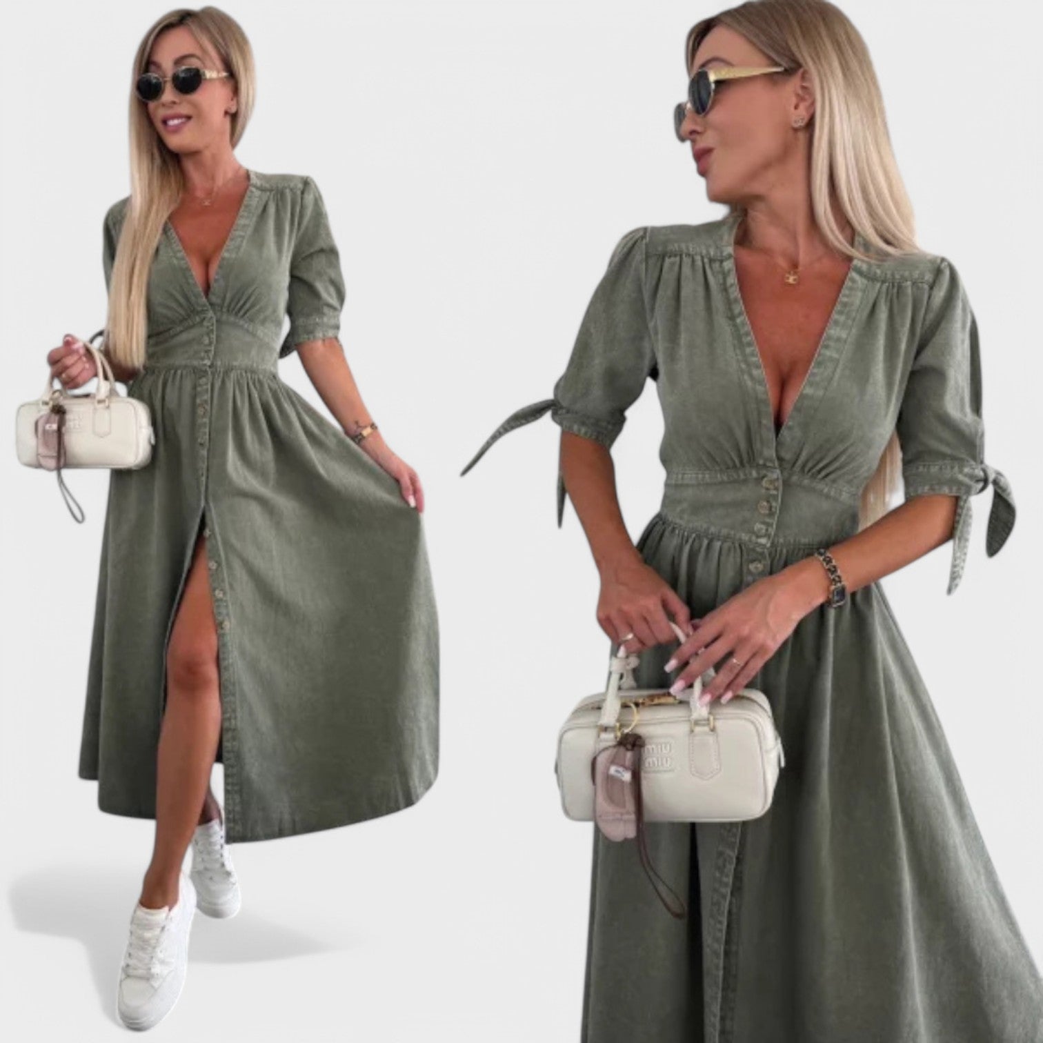 Sokoldalúság – Az olívazöld szín és a farmer hatású anyag könnyen kombinálhatóvá teszi ezt a ruhát. Hordhatod sportcipővel a laza hétköznapokra, vagy magassarkúval elegánsabb alkalmakra.
