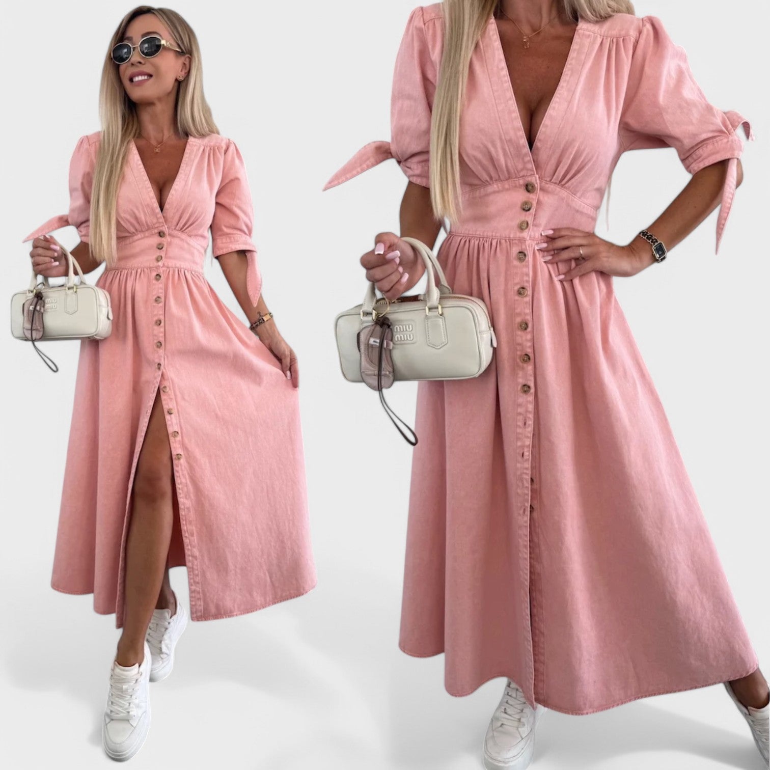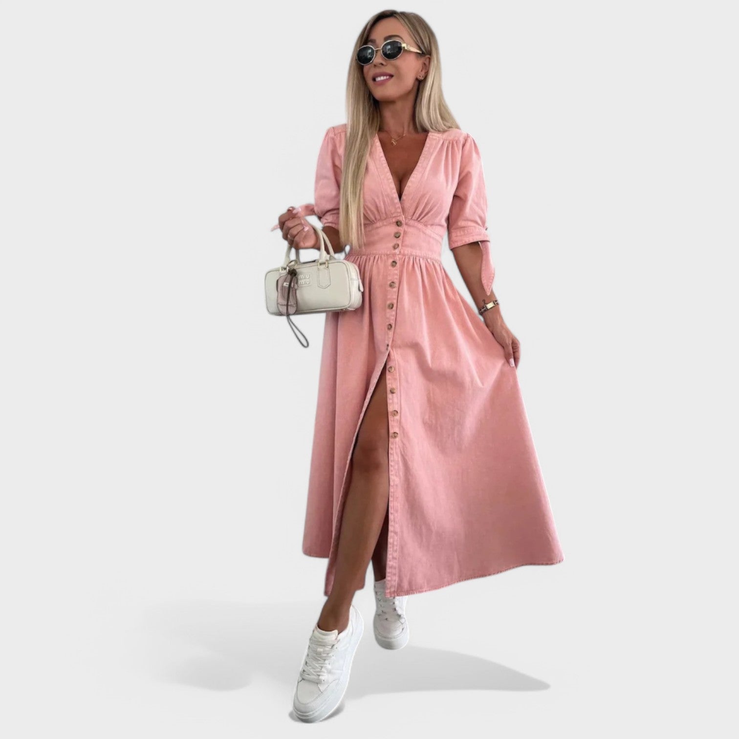 Előnyös fazon – A V-nyakkivágás, a karcsúsított derékrész és a sliccelt szoknya optikailag nyújtják az alakot, kiemelik a sziluettet anélkül, hogy túl szoros lenne.