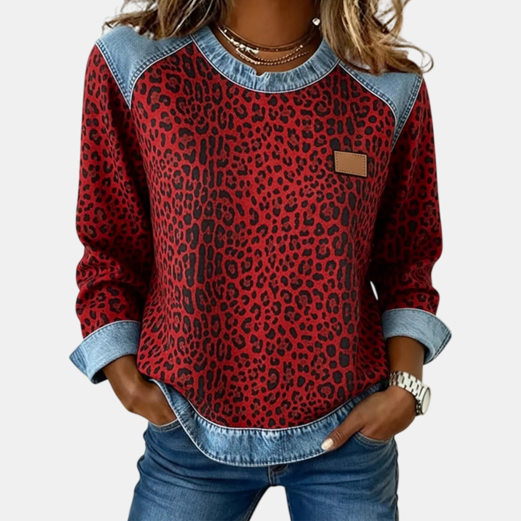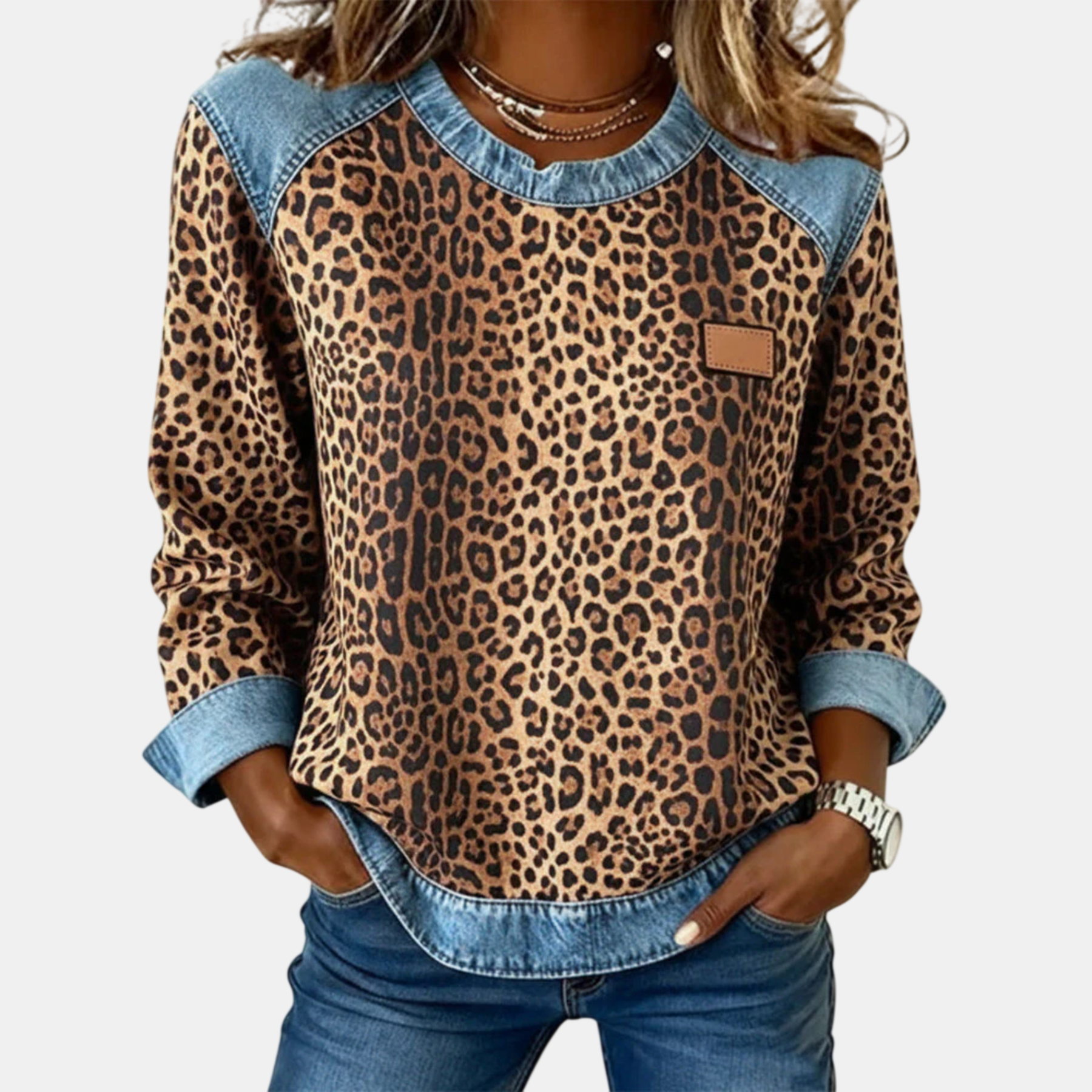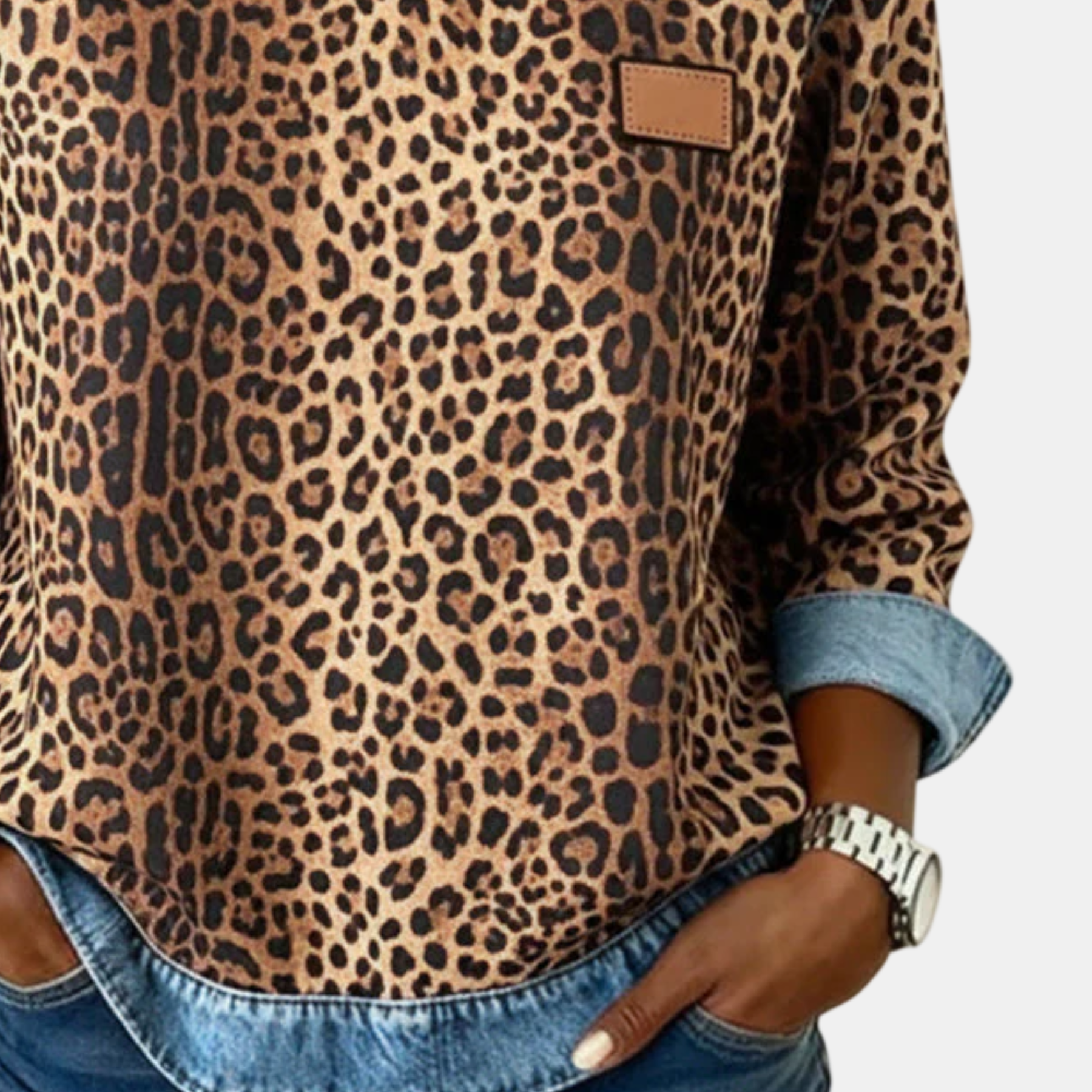 O mintás állatmotívum, intenzív és kifinomult megjelenésével személyiséget és magabiztosságot sugároz, míg a denim részletek elegáns és kortárs kontrasztot teremtenek, finom exkluzivitással emelve a darabot.